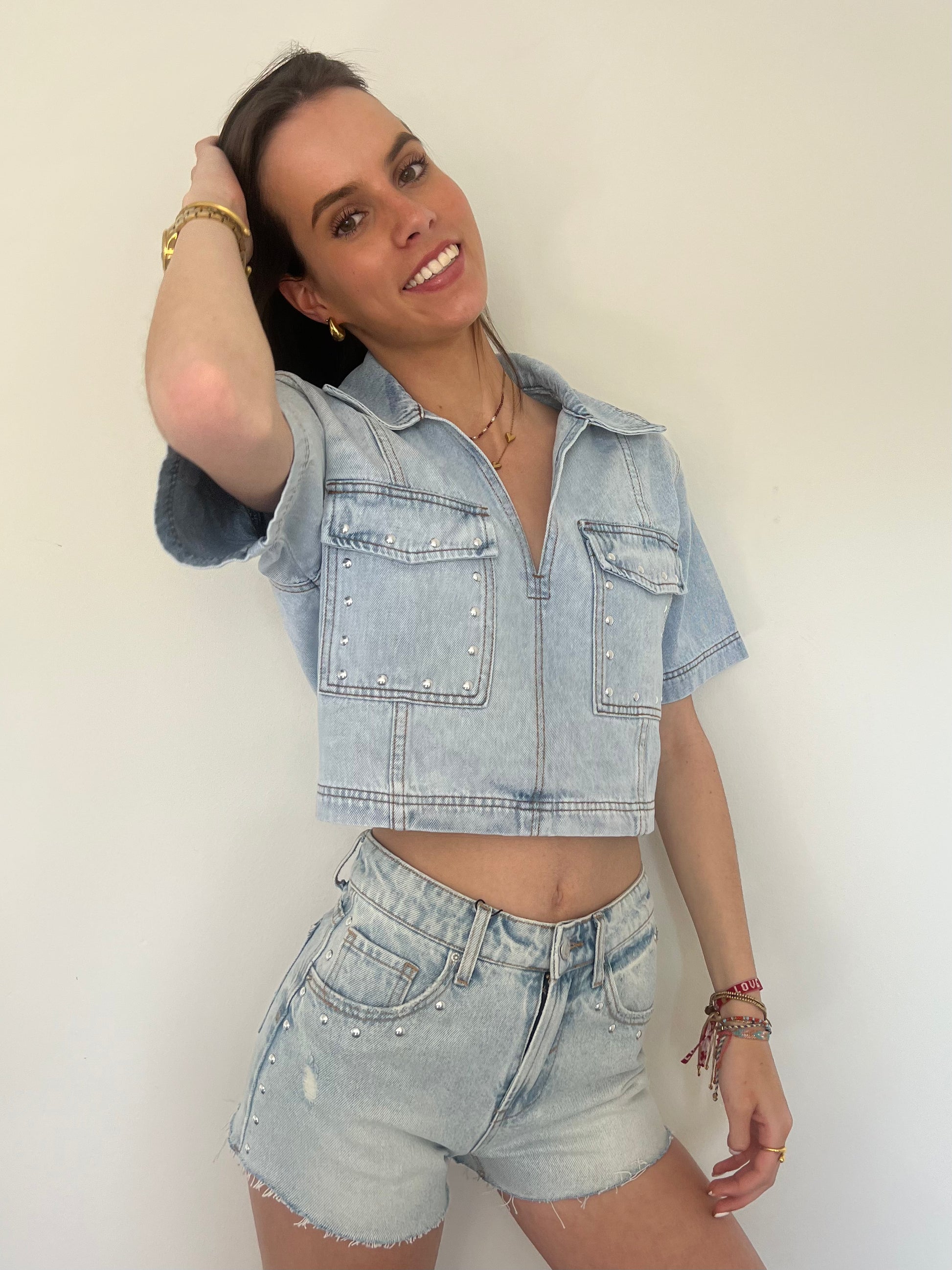 Deze denim top met studs is perfect voor festivals of een zomerse dag. De v-hals en het luchtige model maken het een comfortabel en stijlvol item. De studs aan de voorzijde zorgen voor een opvallend detail dat de top net iets specialer maakt.