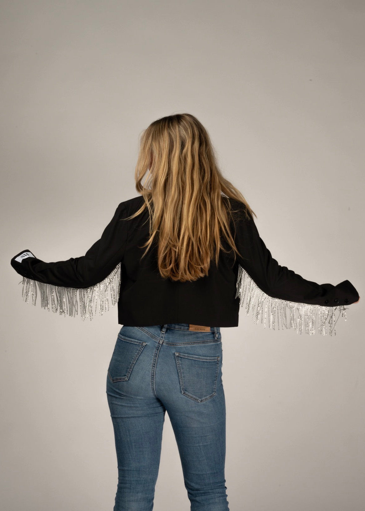 De Diamond Fringe Blazer (Short) is een echte eye catcher. De korte blazer is afgewerkt met franjes van diamantjes langs de mouwen, waardoor hij een speelse maar chique uitstraling krijgt. Ideaal voor festivals, feestjes of een avond uit waarin je nét dat beetje extra wilt.
