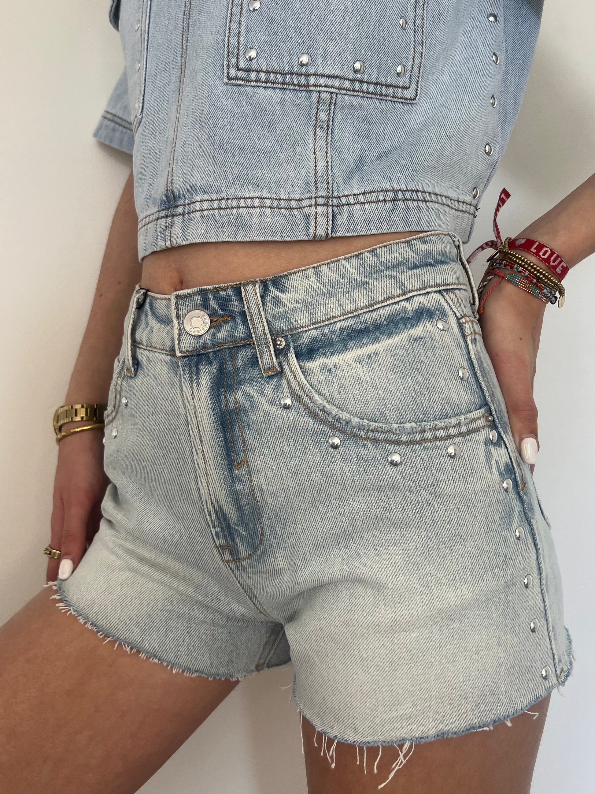 Denim short met studs aan de voorzijde is een echt musthave! Een opvallend detail dat de short een unieke uitstraling geeft. Makkelijk te combineren en perfect voor warme dagen.